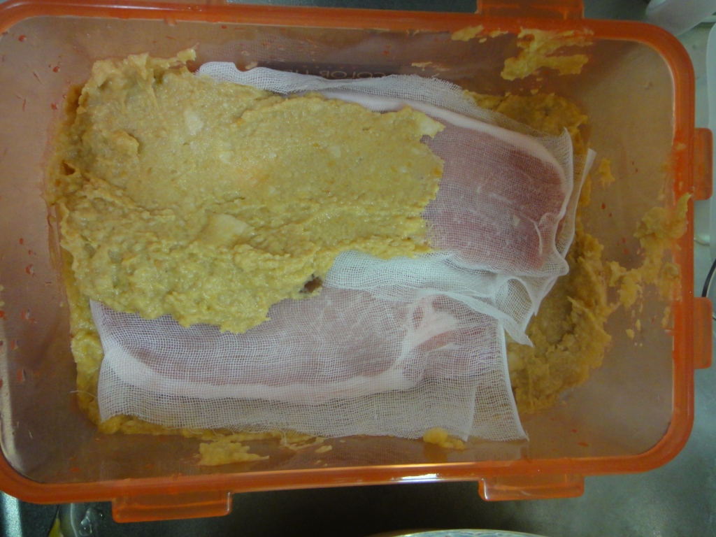 ● 容器に味噌粕を3㎝以上の厚さになるようにしき、ガーゼを乗せます。