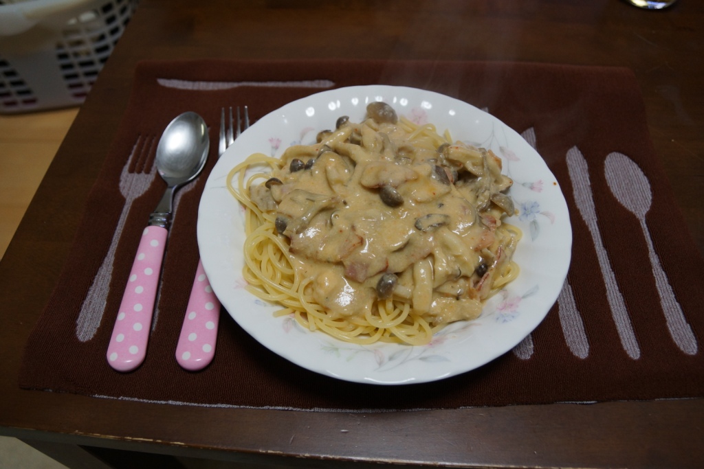 レトルトの明太クリームパスタを使用し、アレンジでキノコを入れました。