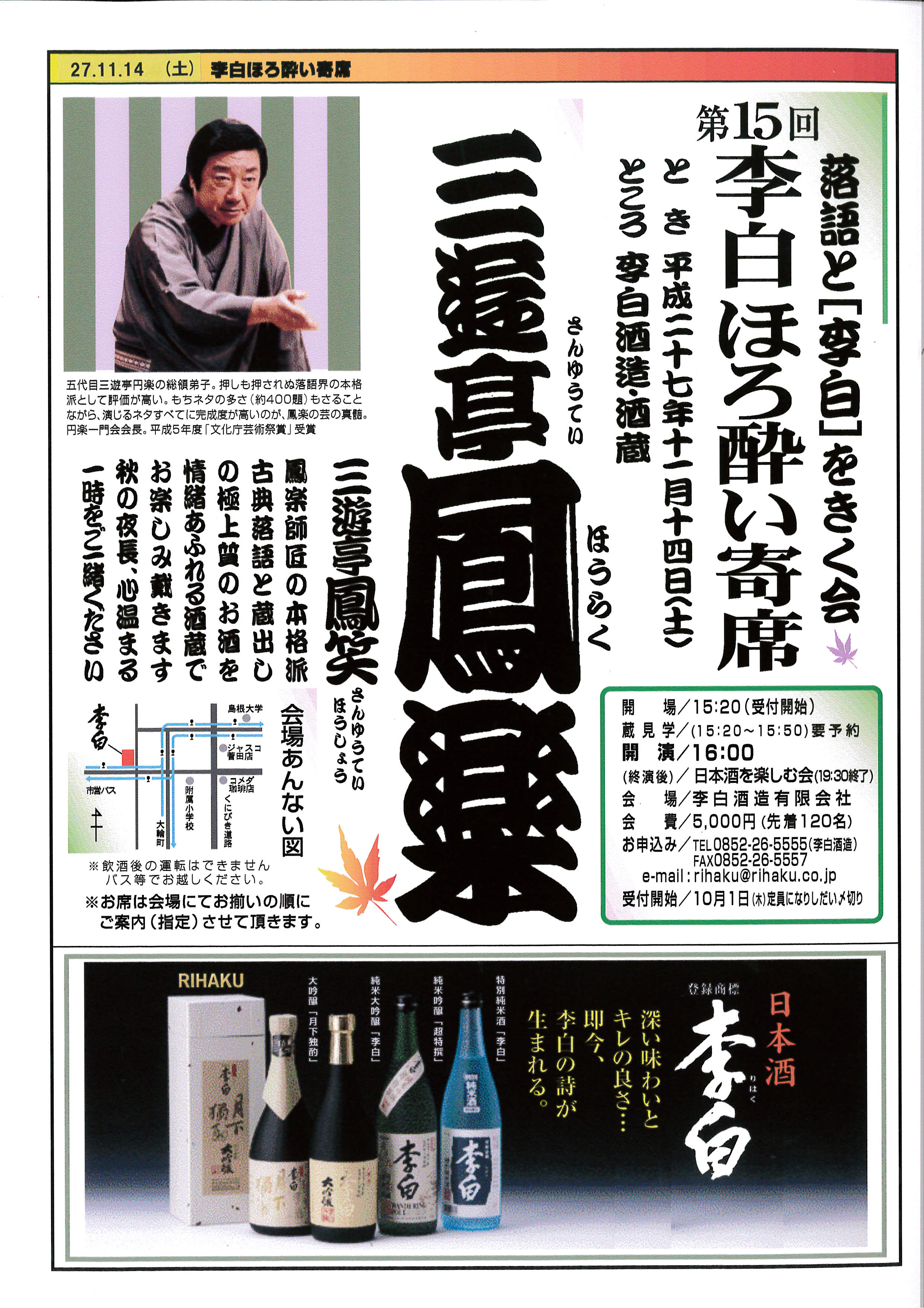 本日より 第15回 李白 ほろ酔い寄席 の予約受付を開始いたします。