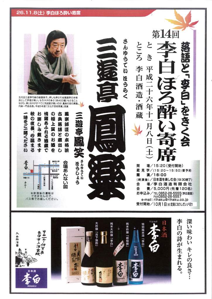 (FAX、メールの場合は、「ほろ酔い寄席申込み」とし、参加人数、お名前、お申込み者様のご連絡先、蔵見学の有無をお伝えください)