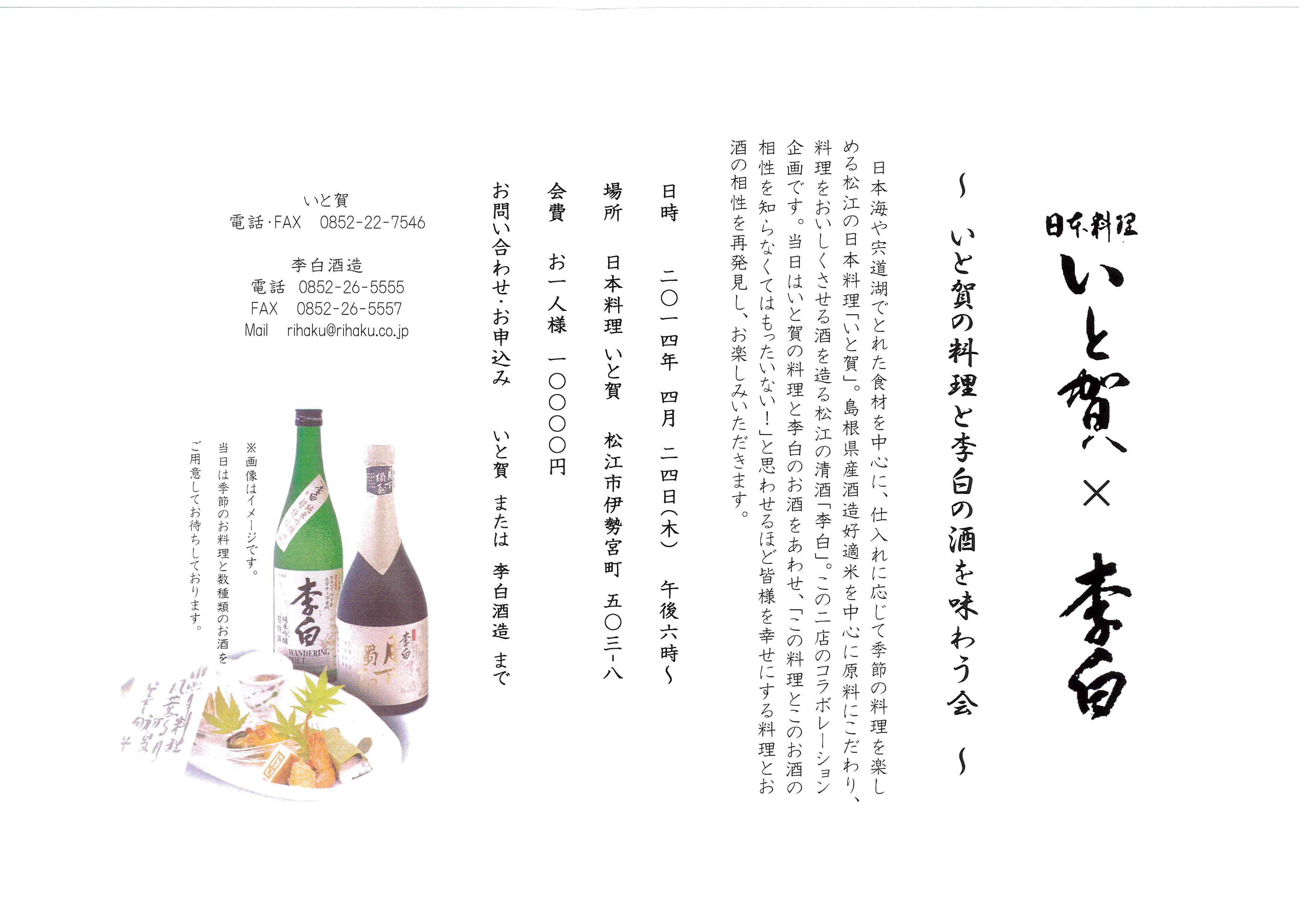 ぜひこの機会にいと賀のおいしい料理と李白のお酒をゆっくりと堪能なさってください。