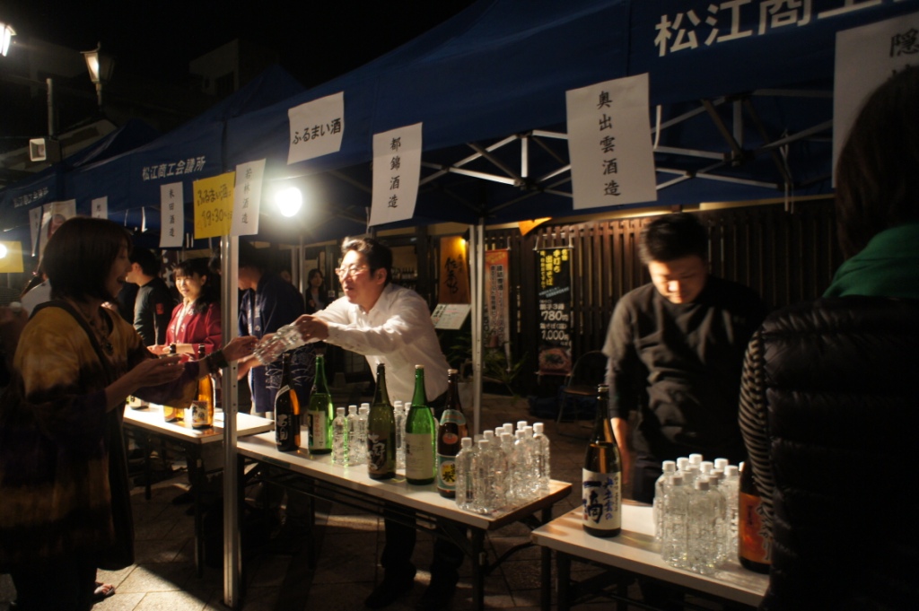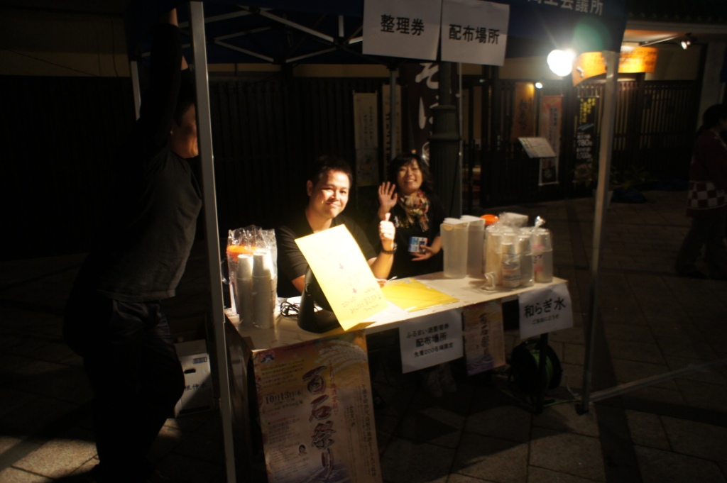 こちらで振舞い酒の整理券を配布。(出雲富士の今岡さんと、李白みちこ)