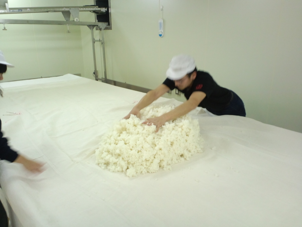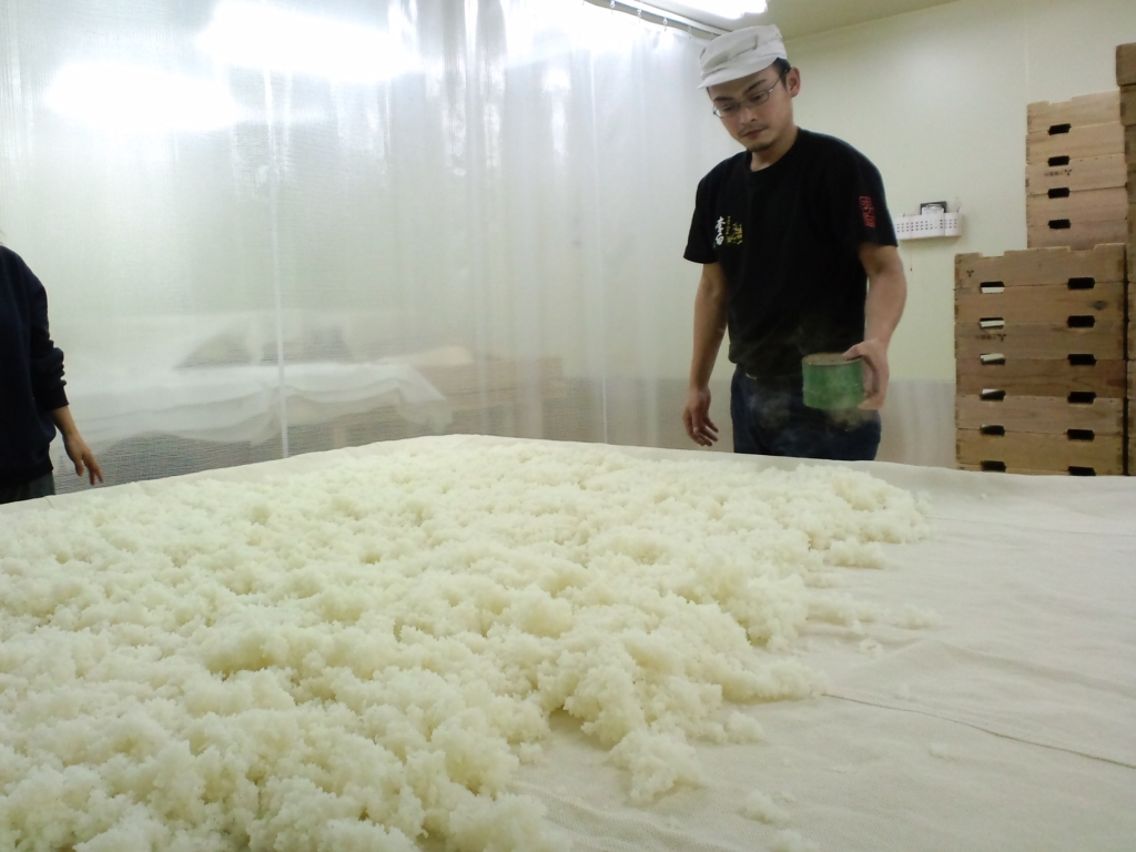 蒸米に 麹菌をふり、 米麹を作る作業。