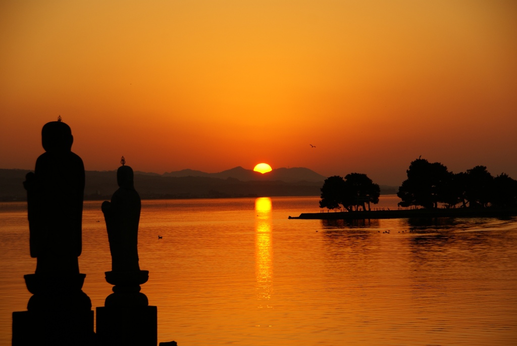 夕暮れ時に宍道湖に