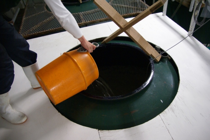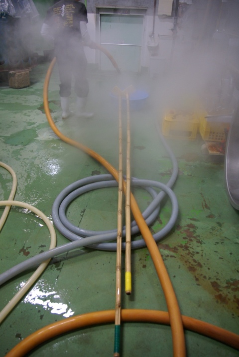 姿を追いかけると、タンクを混ぜる時に使用する 櫂(かい) という棒に 蒸気をかけ、