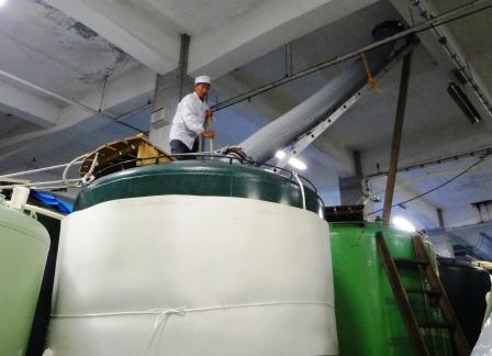 蒸したもち米が上の階から、下の階のタンクへちゃくちゃくと降りてきてます。