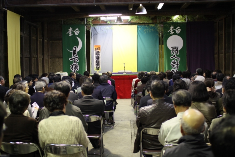 高座は社員お手製の、P箱と畳と竹を使った高座です。→